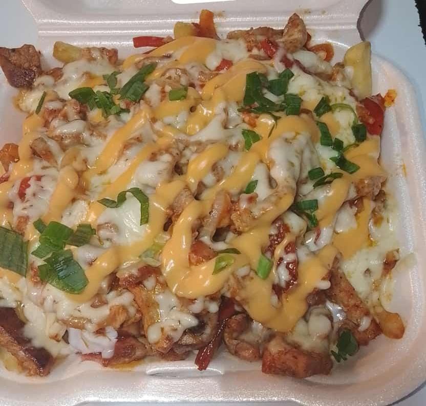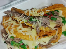 Papi carne de papas a la francesa, carne en fajitas y queso mozzarella.