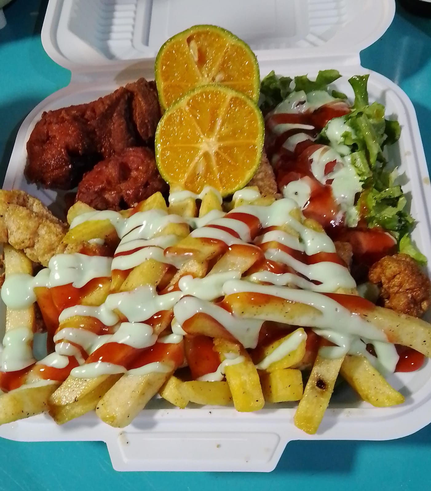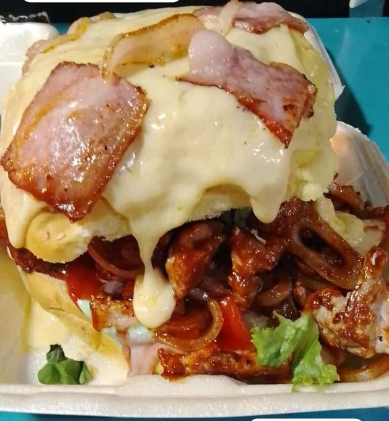 Deliciosa pequeña hamburguesa con jamón, queso, lechuga, salsa de tomate, mayonesa casera y torta de res. Acompañada de papas fritas.