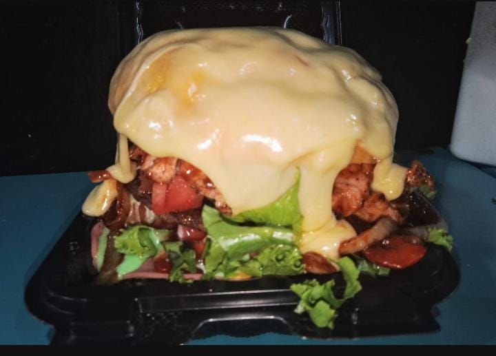 Hamburguesa Premium Pan artesanal, jamón de res , queso torta fajitas de carne y salsa de la casa más queso derretido.