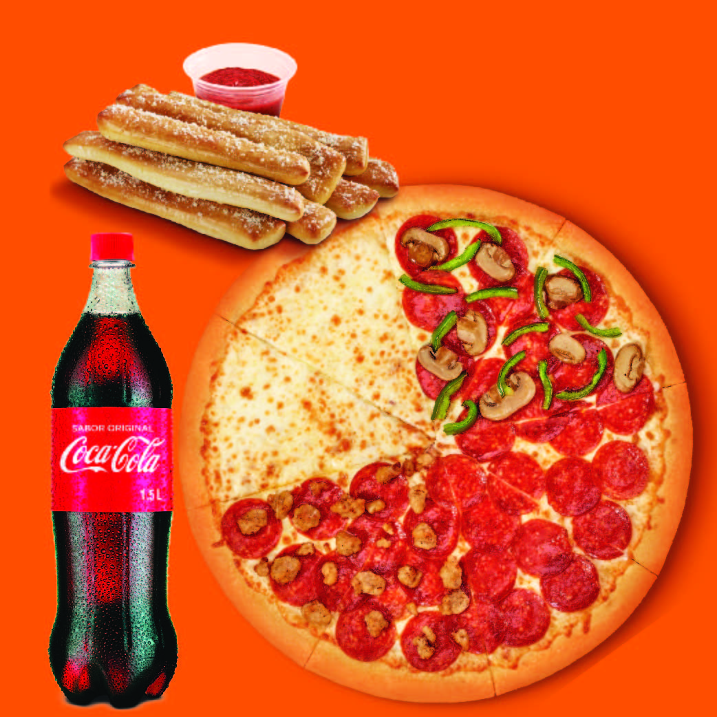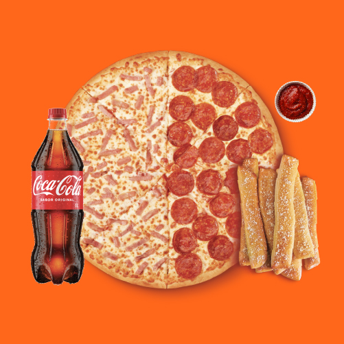 Incluye: 1 pizza grande doble sabor( extra jamón y extra pepperoni), 1 crazy combo (crazy bread + crazy sauce), 1 soda de 1.5 L a elegir.