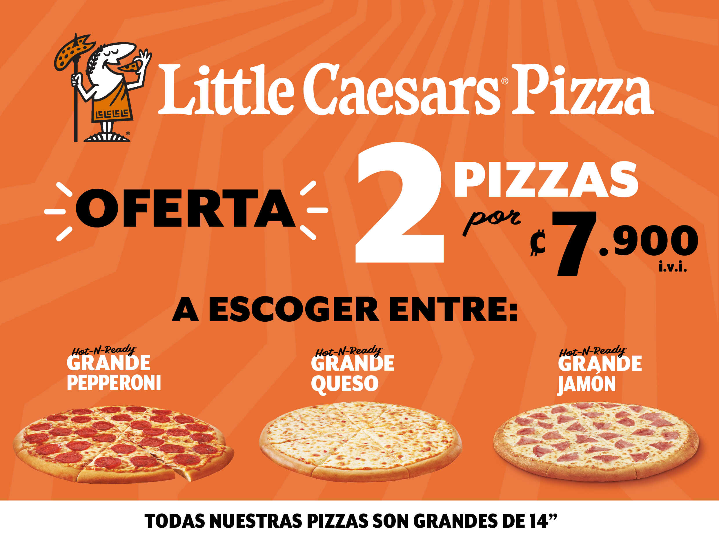 2 Pizzas grandes14" de Pepperoni, Queso o Jamón.