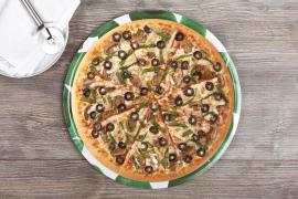 Pizza grande 14" vegetariana. Preparada con hongos, pimentón verde, aceitunas negras, cebolla y nuestra deliciosa salsa de tomates y emblemática mezcla de quesos.
