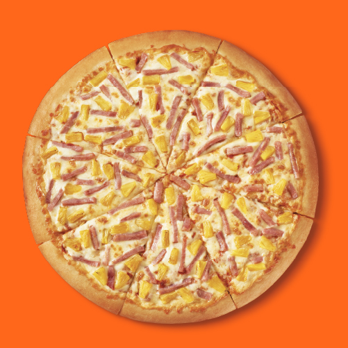 Pizza grande 14" hawaiana. Preparada con jamón y piña, nuestra deliciosa salsa de tomates y emblemática mezcla de quesos.
