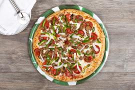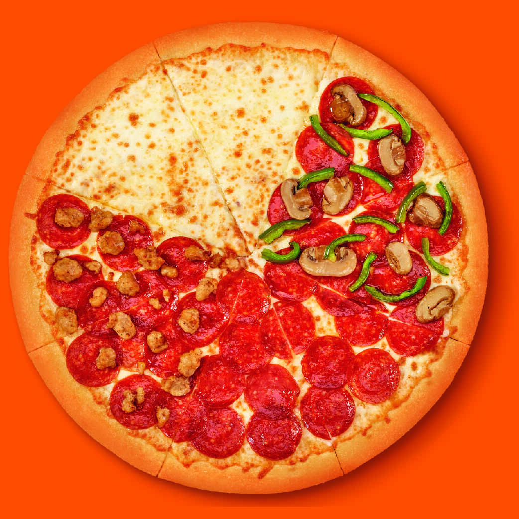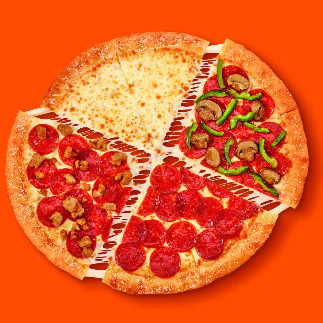 Pizza GRANDE de 14” que incluye: 2 rebanadas con extra pepperoni y salchicha italiana, 2 con extra pepperoni, hongos y pimentón verde, 2 con extra pepperoni y 2 de queso