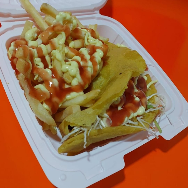 Empanada frita a base de maíz con especies, rellena de pollo y queso mozarella. Arreglada con repollo, pico de gallo, salsa de tomate, mayonesa de la casa. Acompañada con papas fritas, salsa de tomate, mayonesa de la casa y salsa de queso cheddar sobre las papas.