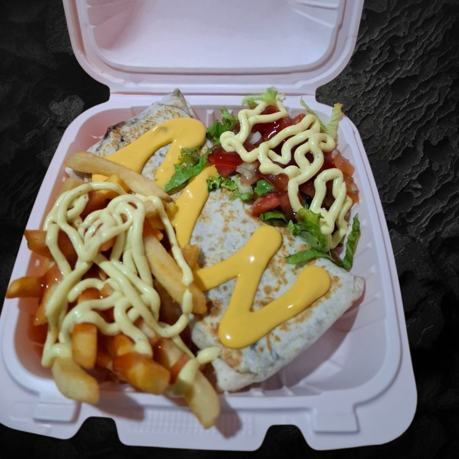 Burrito de tortilla de harina con frijoles molidos, salsa chheddar, queso mozarella, carne de res desmechada, acompañano con papas fritas, ensalada y pico de gallo, con salsa de tomate y mayonesa de la casa.