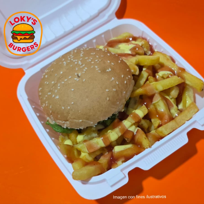 Pan de hamburguesa con ajonjolí, ligeramente dorado con mantequilla, contiene salsa de tomate, mayonesa de la casa, torta del Arreo, rebanada de tomate y lechuga. Acompañada con papas fritas con salsa de tomate y mayonesa de la casa.
