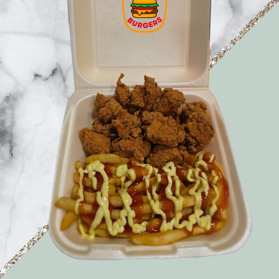 Trocitos de pechuga de pollo, 350 gramos aproximadamente, empanizados con nuestro empanizador con especies, acompañados con papas, salsa de tomate y mayonesa de la casa.