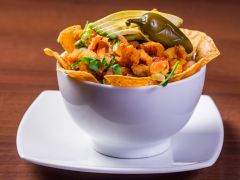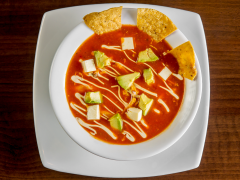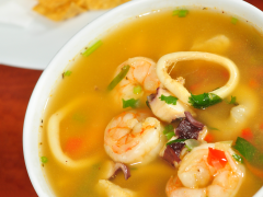 Sopa preparada a base de una salsa tipo peruana de tomate acompañado de mariscos, arroz y tortillas asadas.