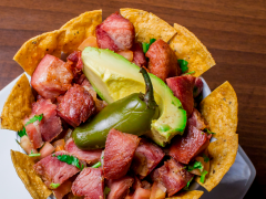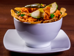 Preparación a base de tomates asados acompañado con pollo, queso, aguacate y chips.