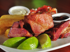 Chicharrón de cerdo, ensalada mixta, yuca y salsa bbq.