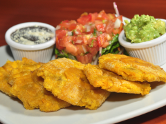 Plátano verde acompañado de ensalada mixta, frijoles molidos y guacamole.