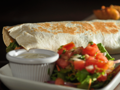 Tortilla de harina, ensalada mixta, fajitas de pollo, salsa tartara y queso cheddar.