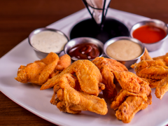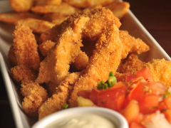 Fajitas de pollo empanizadas, acompañado de ensalada mixta, papas en gajo y salsa tártara.