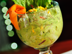 Ceviche estilo peruano a base de corvina elaborado con aguacate acompañado de plátano tostado, tradicional elote y camote.