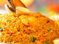 Arroz con mariscos acompañado con ensalada mixta y tortillas chips.