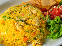 Arroz con pollo acompañado con ensalada mixta y tortillas chips.