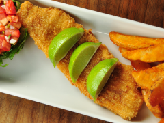 Fajitas de pescado empanizadas, acompañada de ensalada mixta, papas en gajo y salsa tártara.