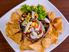 Ceviche a base de corvina estilo peruano acompañado con tortillas chips, tradicional elote y camote.