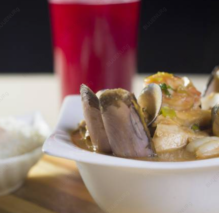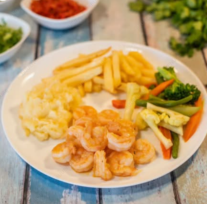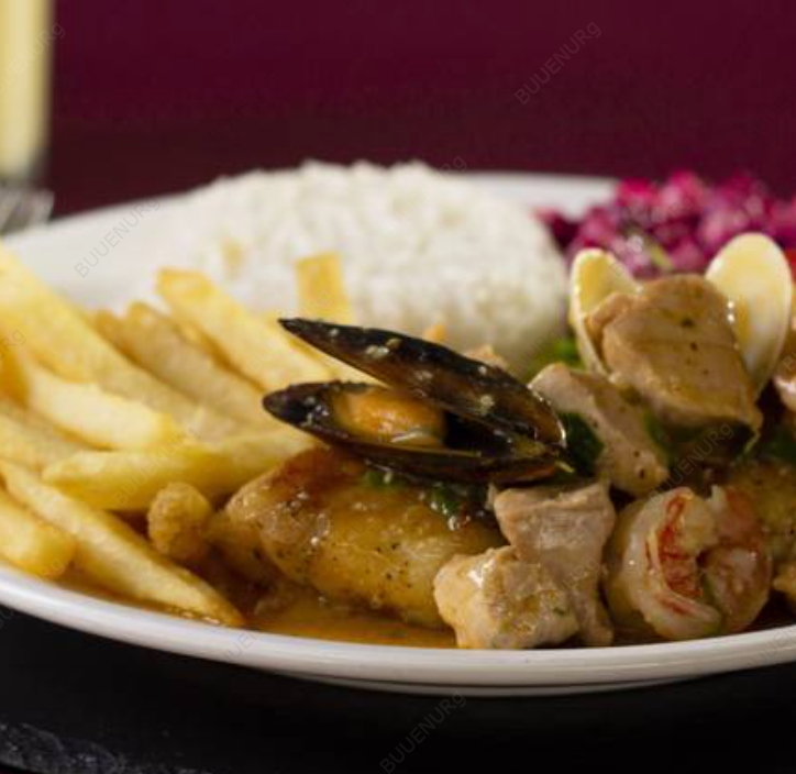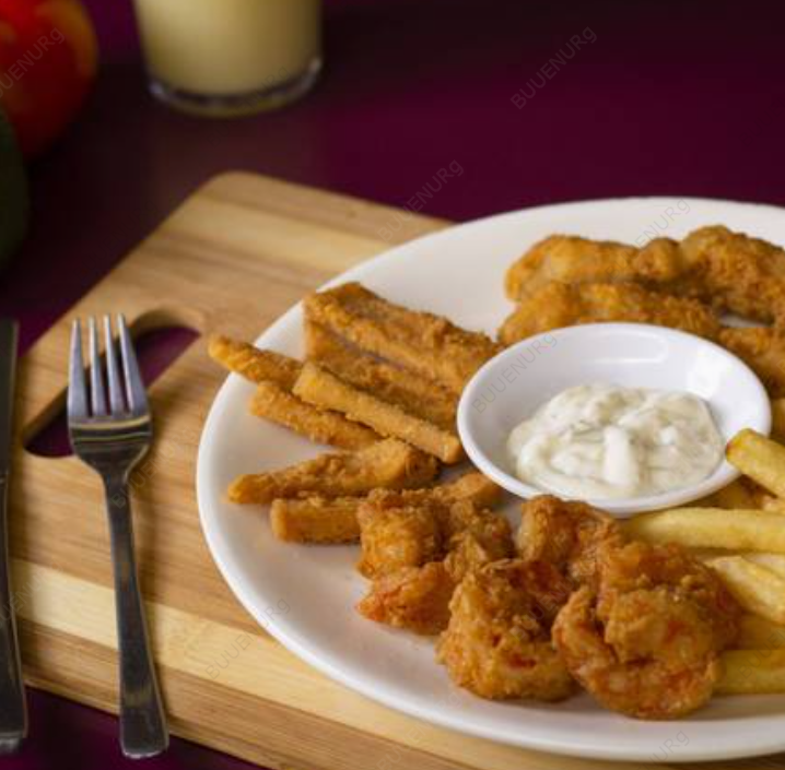 Calamar, camarón y pescado, acompañado de papitas y patacones.