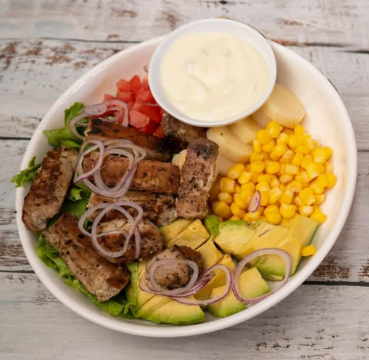 Puedes escoger entre pasta o lechugas frescas, lleva maíz dulce, aguacate, cebolla, tomate y palmito.