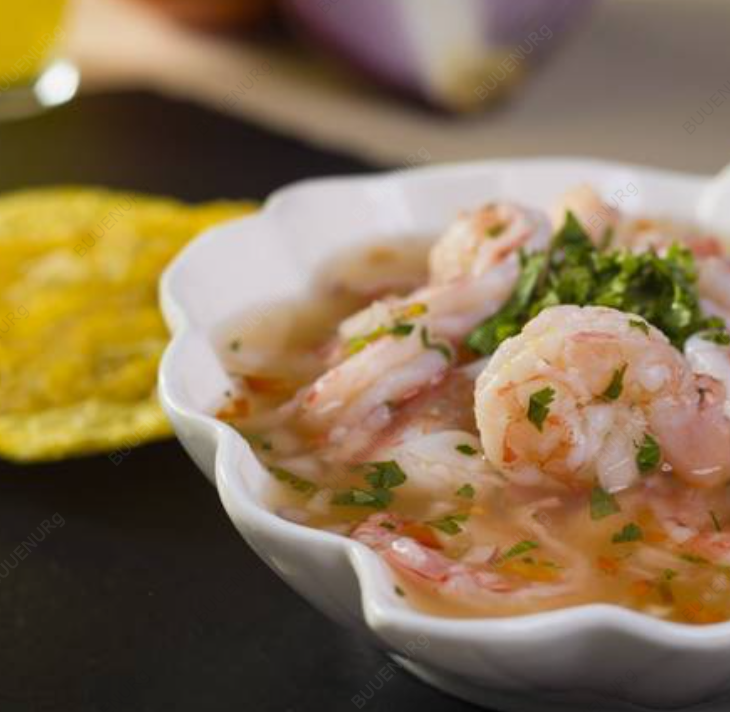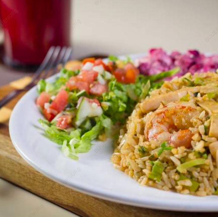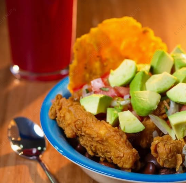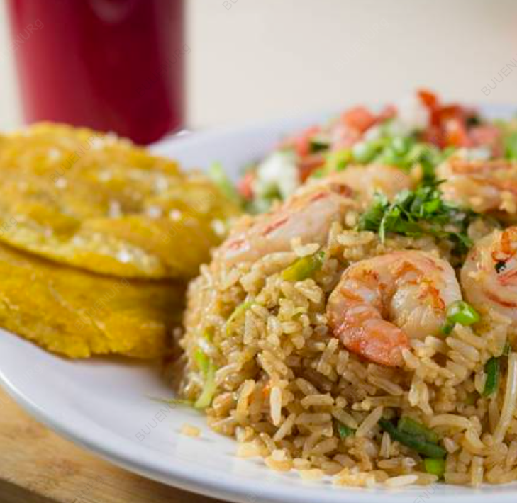 Frijoles tiernos en una cama de arroz fresco, con camarones preparados a su elección, pico de gallo, aguacate y 2 patacones recién hechos.