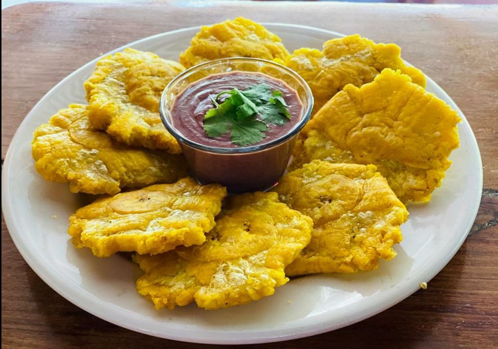 Frijoles tiernos en una cama de arroz fresco, con el pescado de su elección, pico de gallo, aguacate y 2 patacones recién hechos.