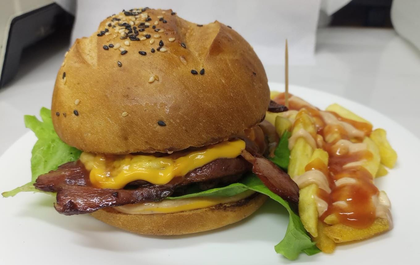 Pan artesanal grande, queso cheddar, cebolla caramelizada, queso mozzarella,tocineta,tomate, carne de res 1/4,de libra,100%casera lechuga, tomate, y salsa especial de la casa acompañada de coca cola 250 ml y papas fritas