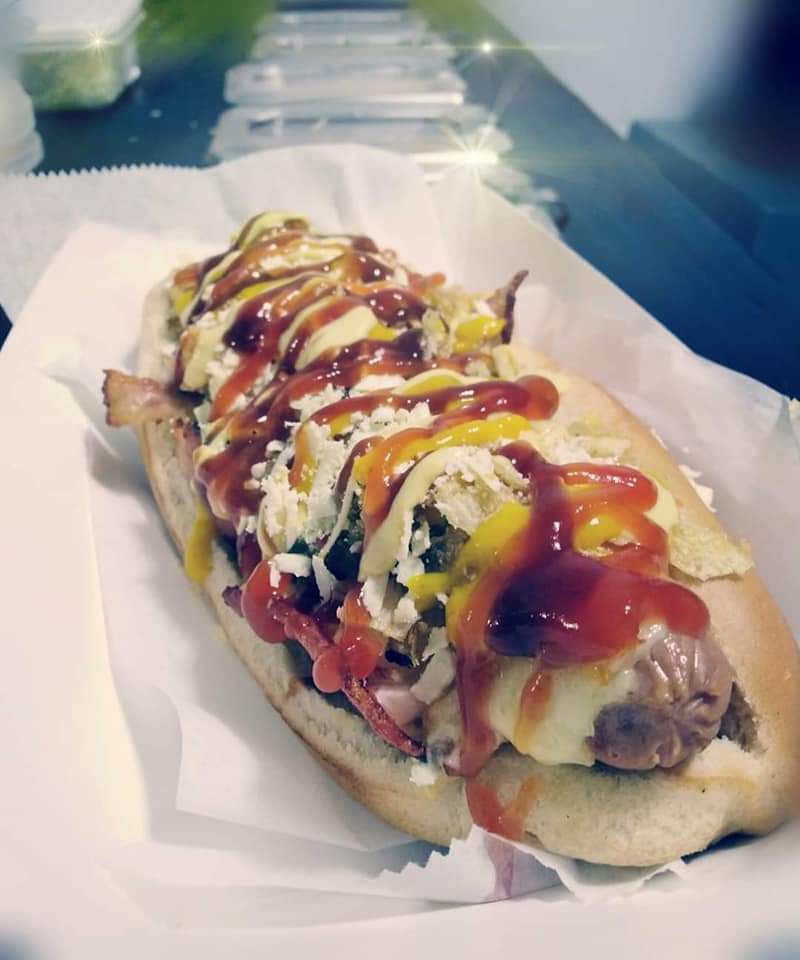 *Pan artesanal *Supe salchicha *Tocineta *Queso mozarella *Ensalada Dulce (repollo y zanahoria) *Papas tostadas *Salsa rosada de la casa * Salsa de piña de la casa