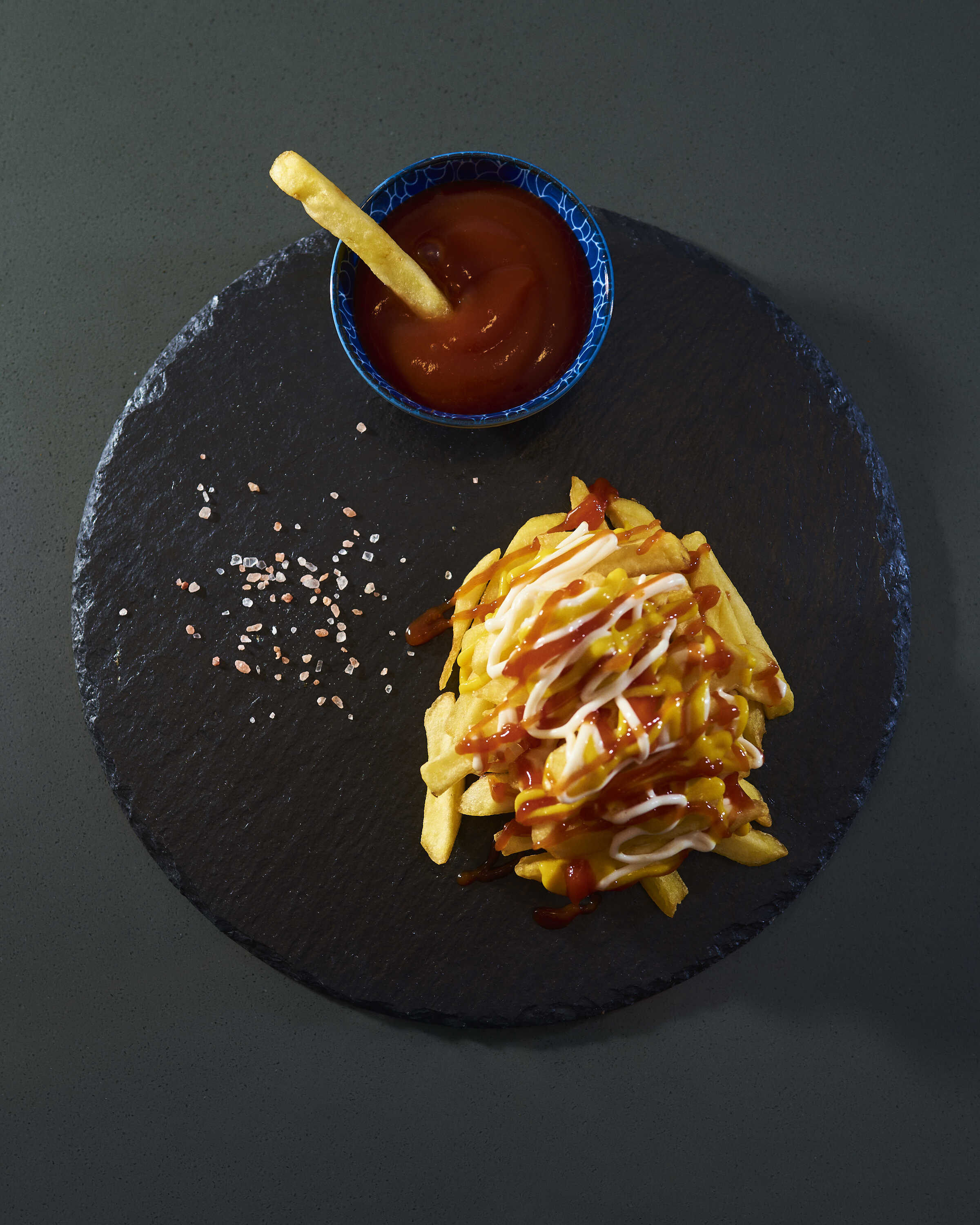 Carne de res mechada, tortilla de maíz, repollo fresco, salsa de tomate kétchup y mayonesa.