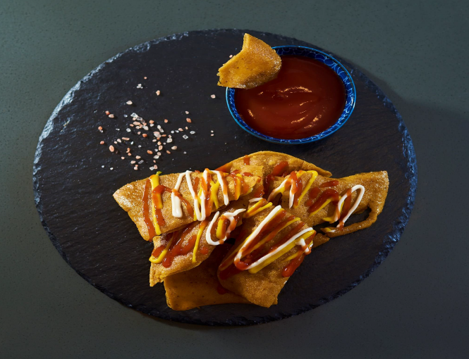 Tres flautas de pollo, papas fritas y salsa artesanal mexicana de la casa