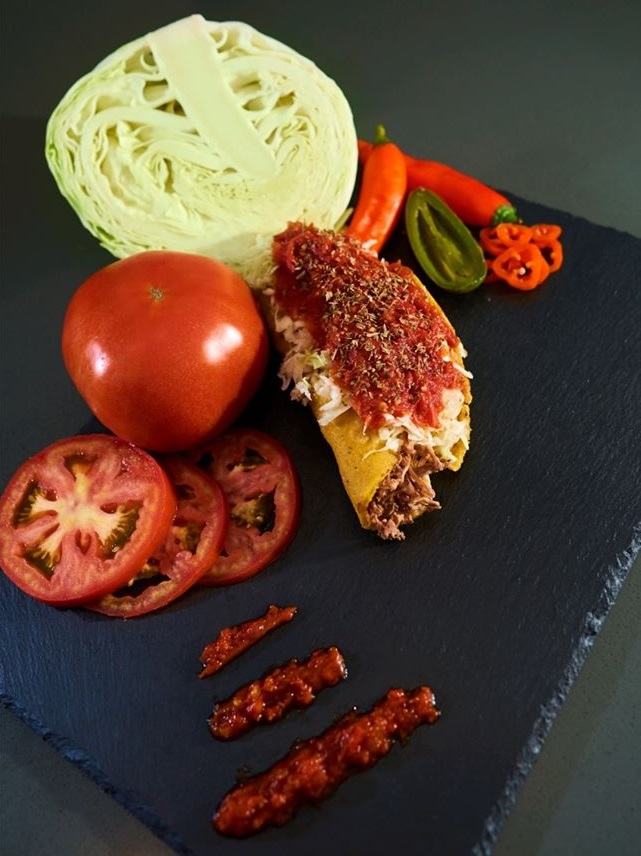 Carne de res mechada, tortilla de maíz, repollo fresco y nuestra salsa mexicana de tomate artesanal con picante.