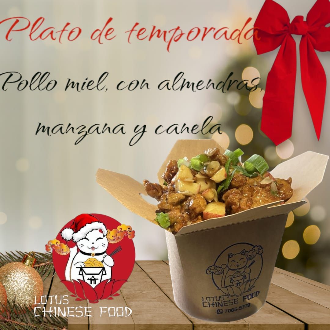 Delicioso pollo tempura con nuestra salsa tipo miel, almendras, manzana y canela.