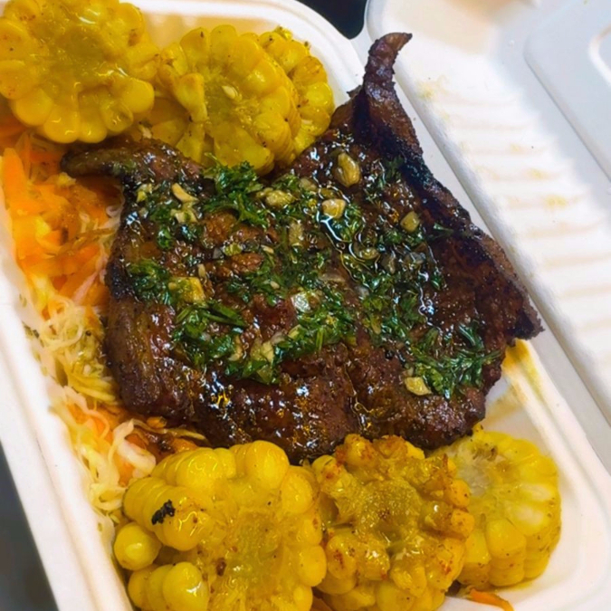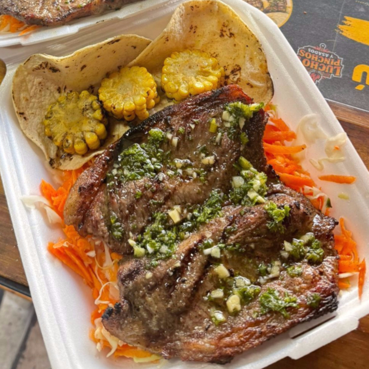 Corte de 200 g acompañados de ensalada de repollo, elote y tortilla.