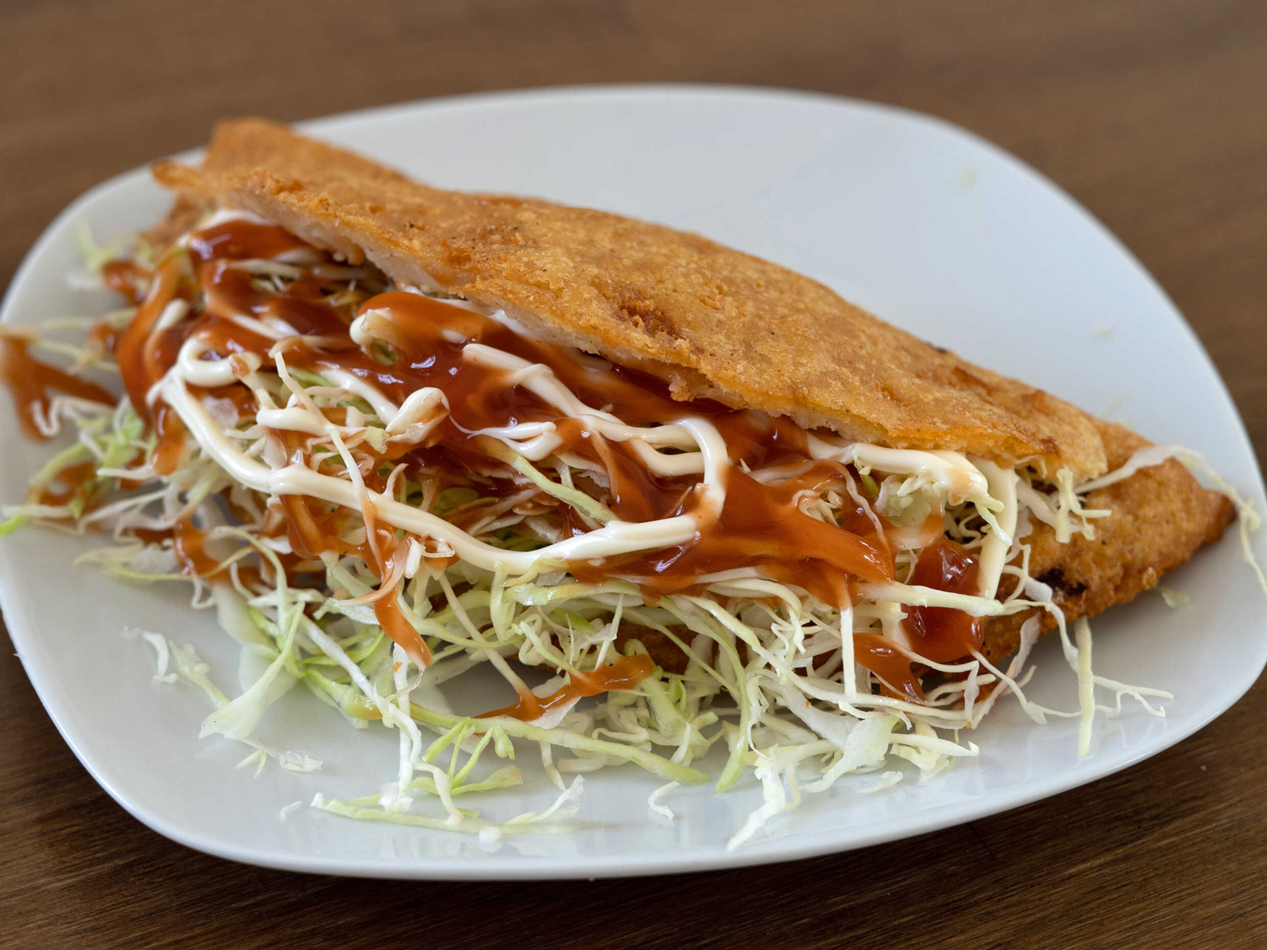 Taco grande arreglado con repollo y salsas.