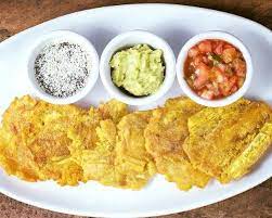 Orden de 5 patacones con frijoles, carne mechada y pico de gallo.