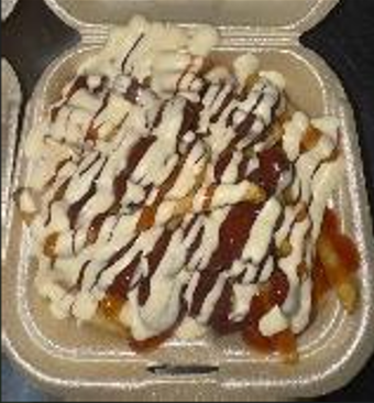 Papas fritas, frijoles, carne de res, salsa de queso, tomate y mayonesa.