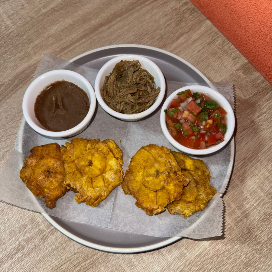 Patacones, acompañados de carne mechada, chimichurri y frijoles molidos