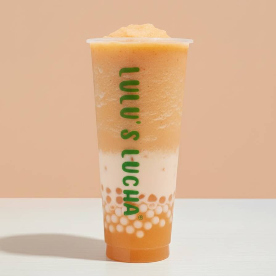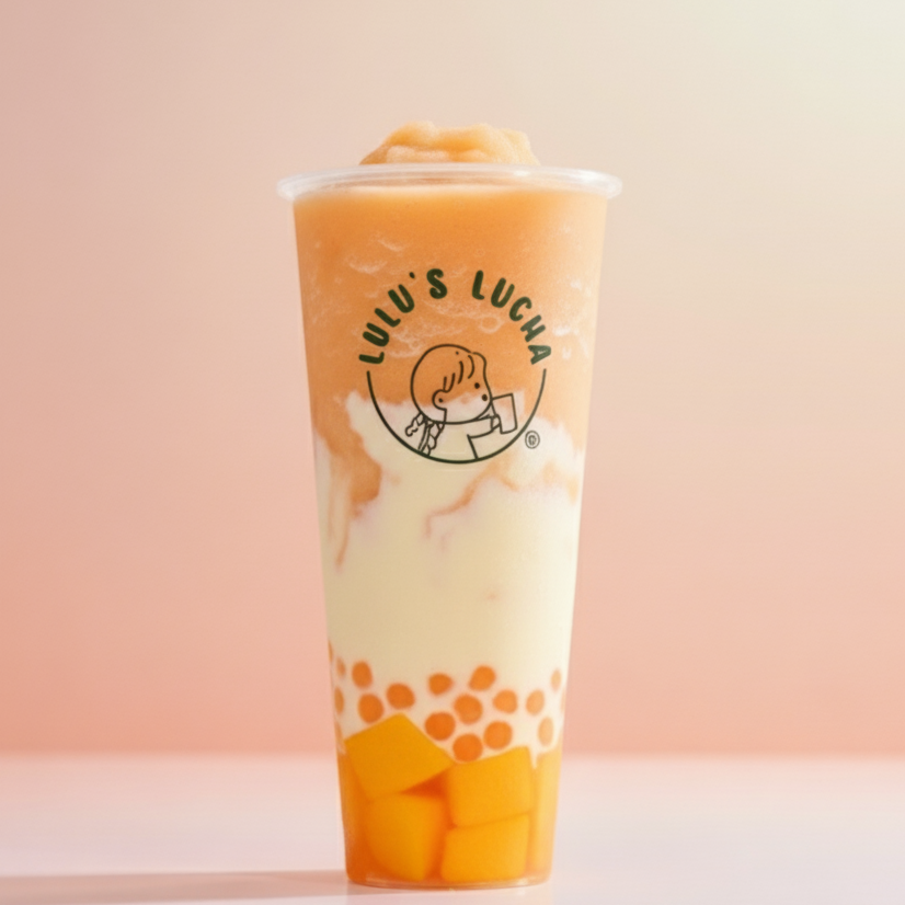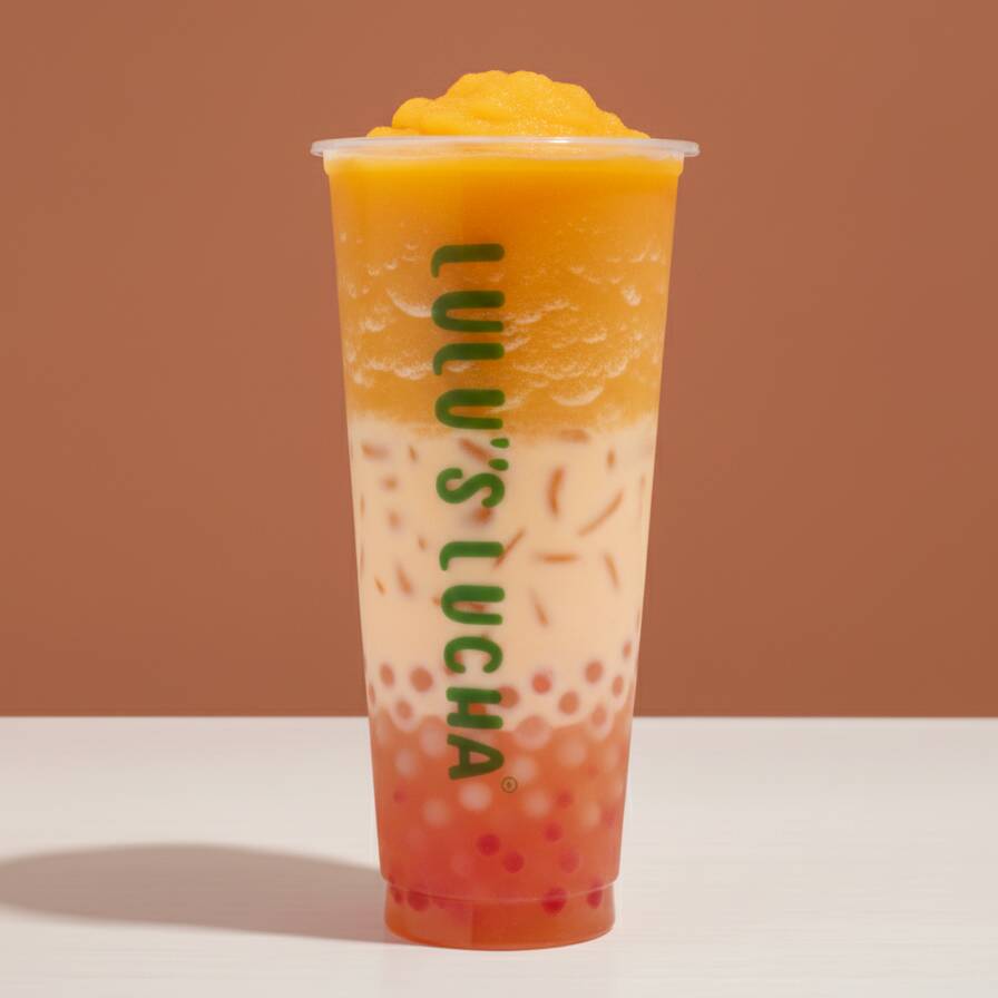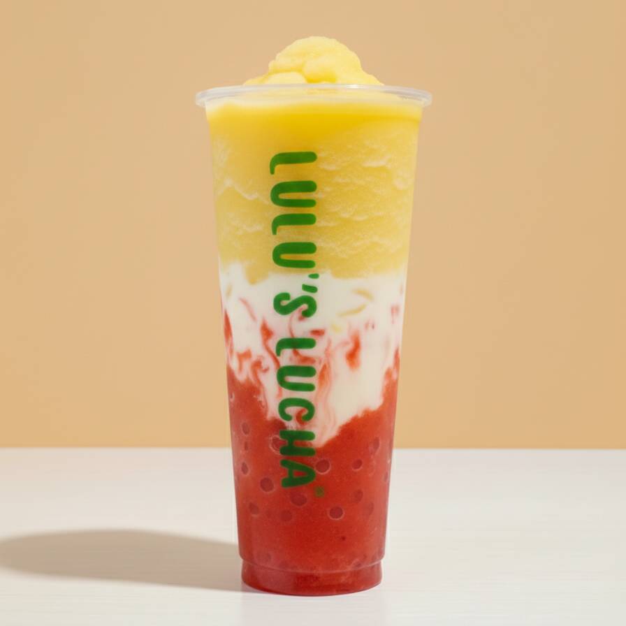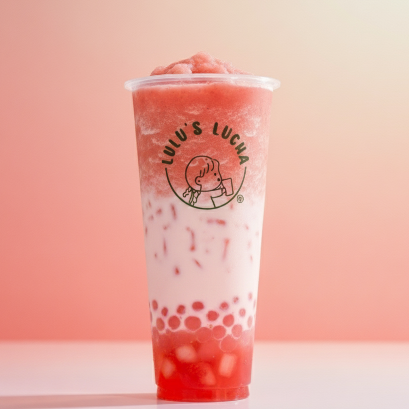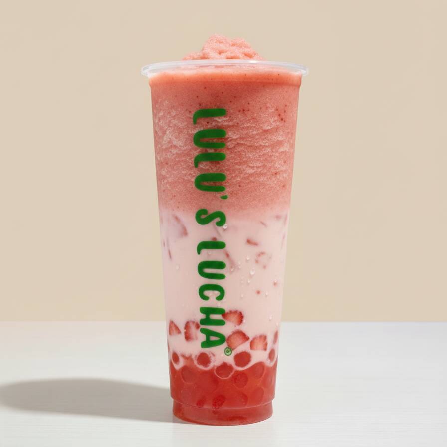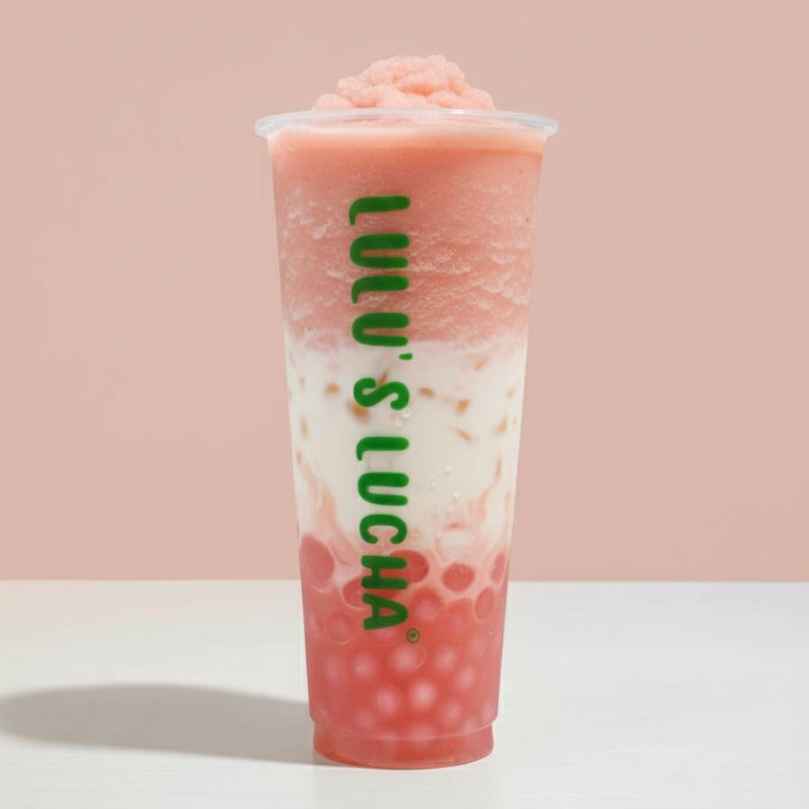 Contiene fruta, azúcar, hielo, agua, jalea, boba explosión y una capa de foamy sabor cheesecake.