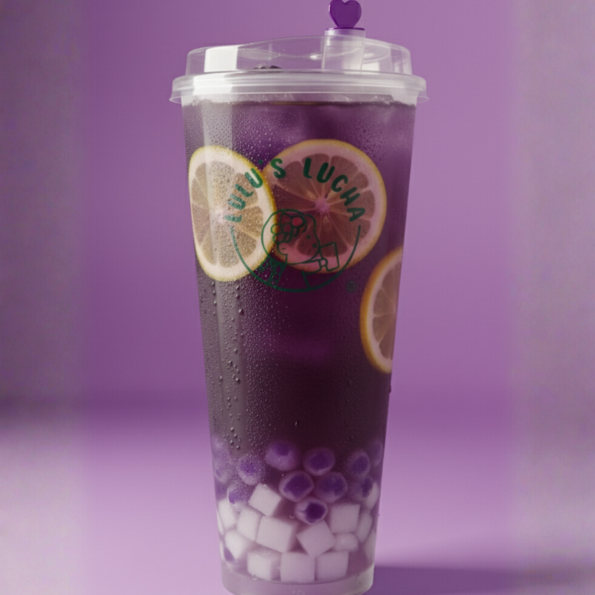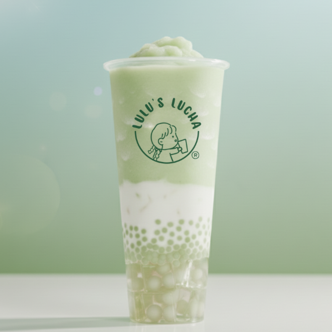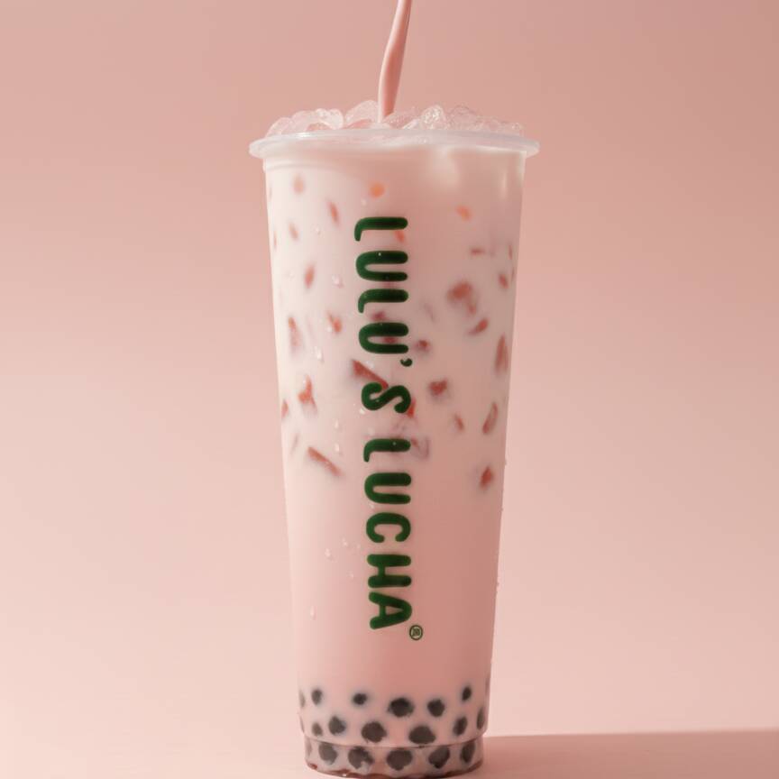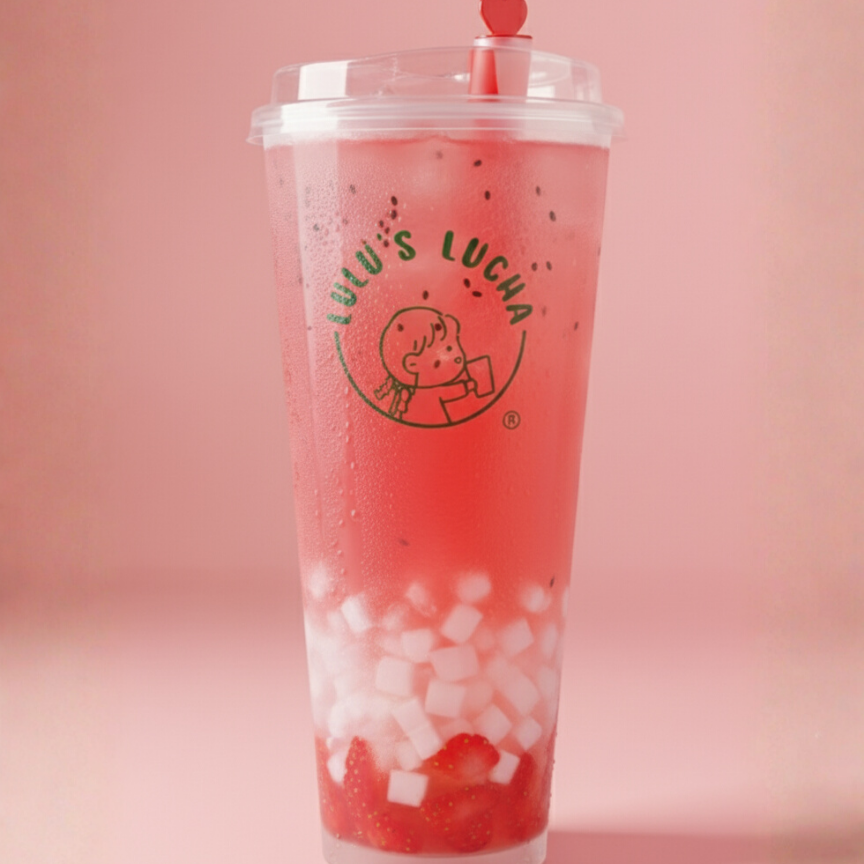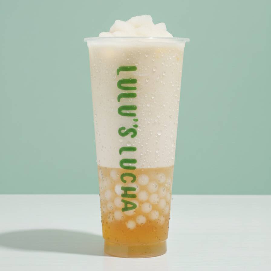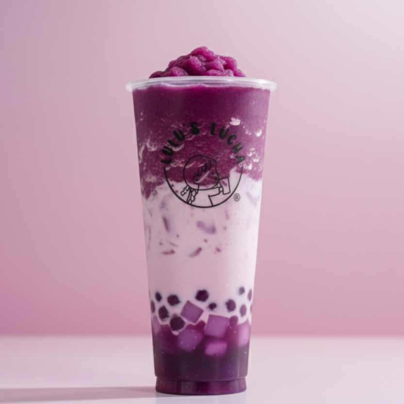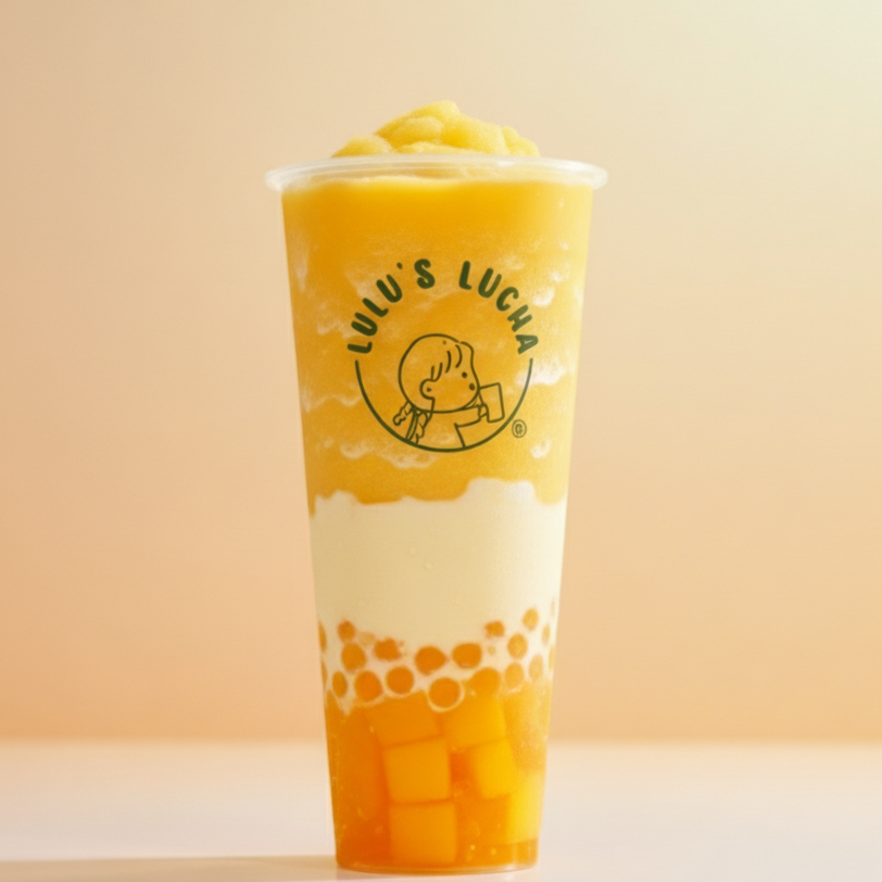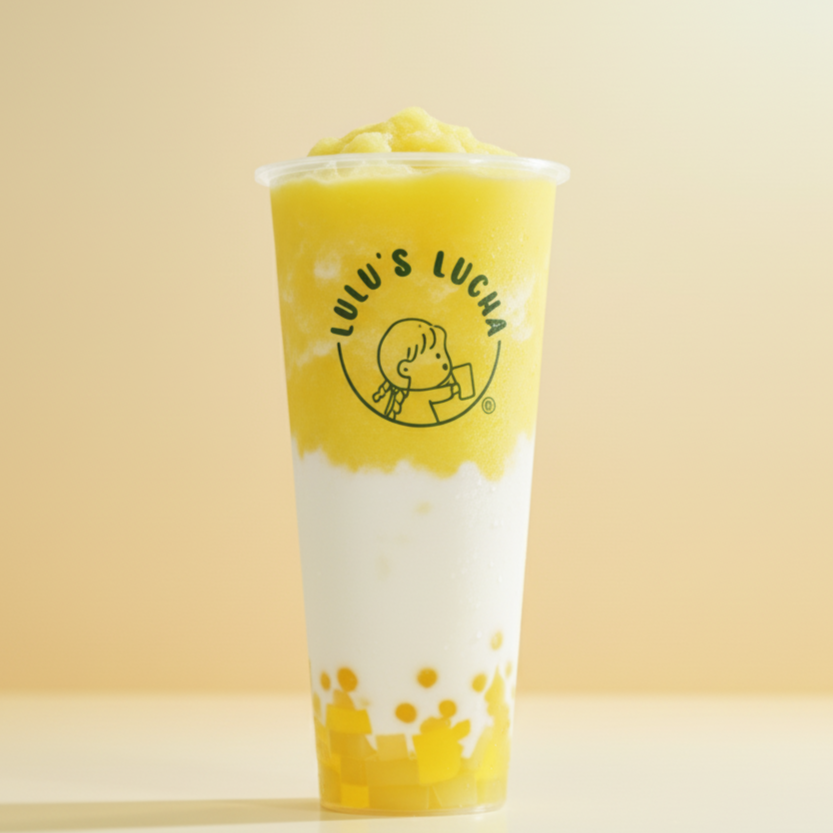 Contiene fruta, azúcar, hielo, agua, jalea, boba explosión y una capa de foamy sabor cheesecake.