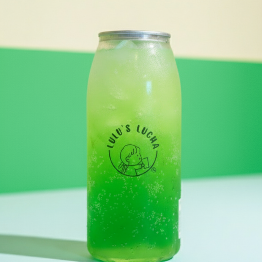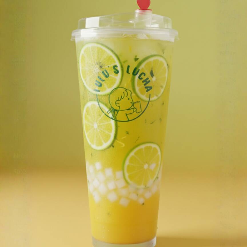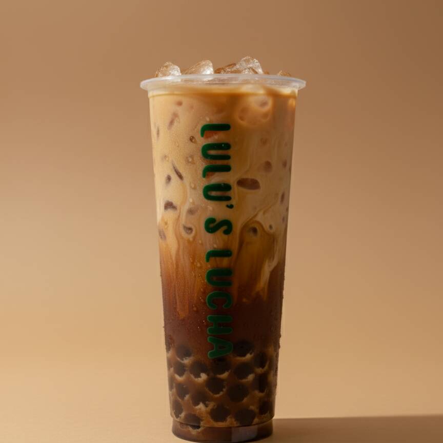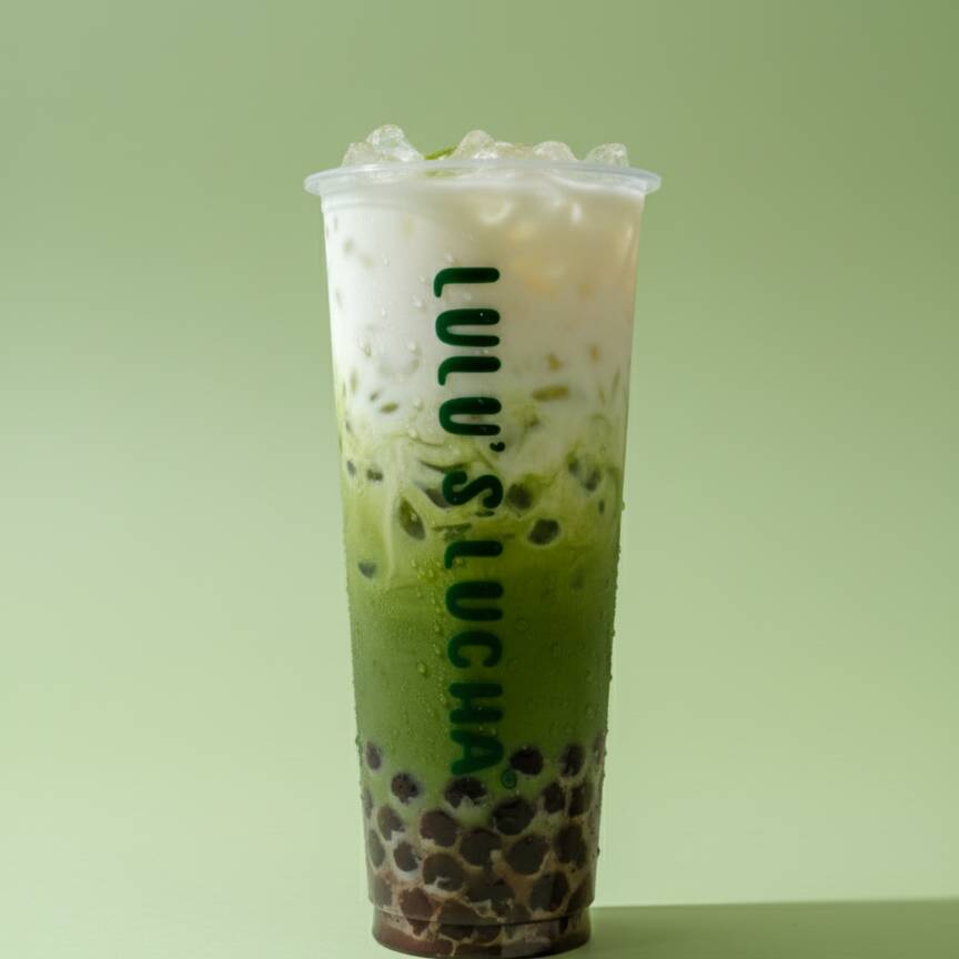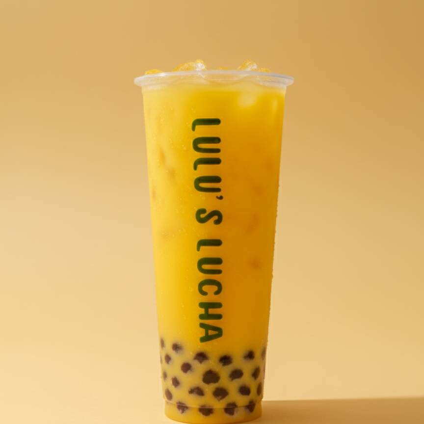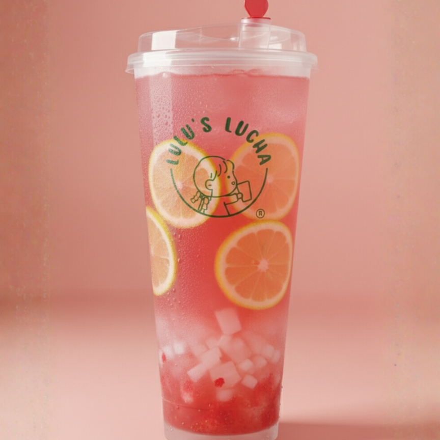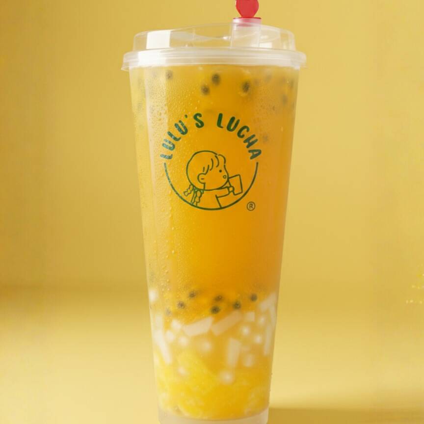 Contiene fruta, azúcar, hielo, agua, jalea, boba explosión y una capa de foamy sabor cheesecake.