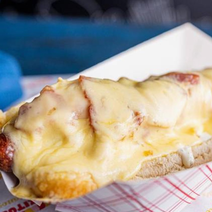 Pan, salchicha, papas tostadas, pollo mechado, tocineta y queso.