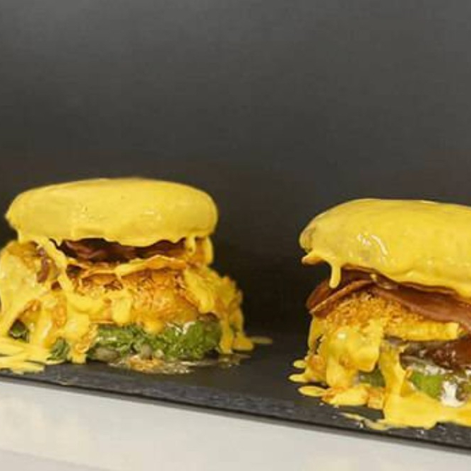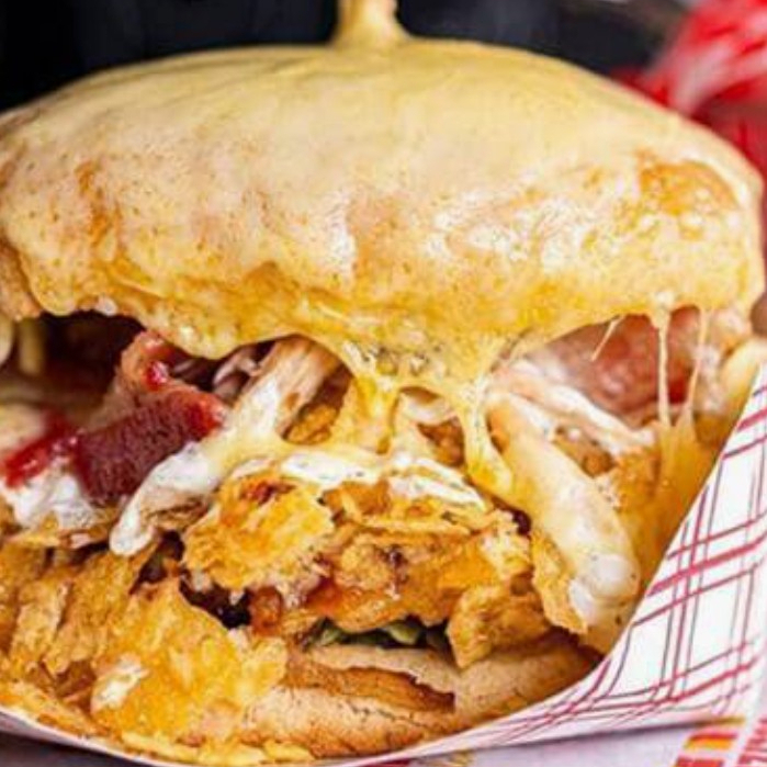 Pan brioche, torta de carne, tomate, lechuga, cebolla caramelizada, queso amarillo, doritos, tocineta crujiente, bañada en queso cheddar.
