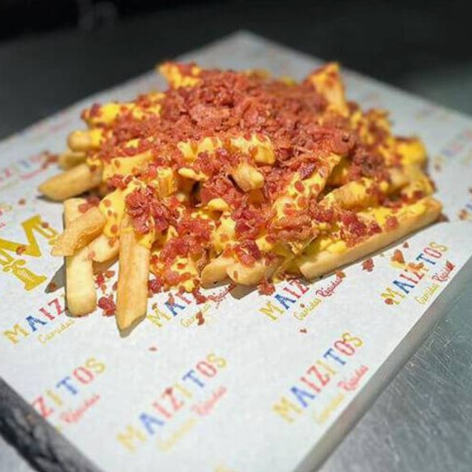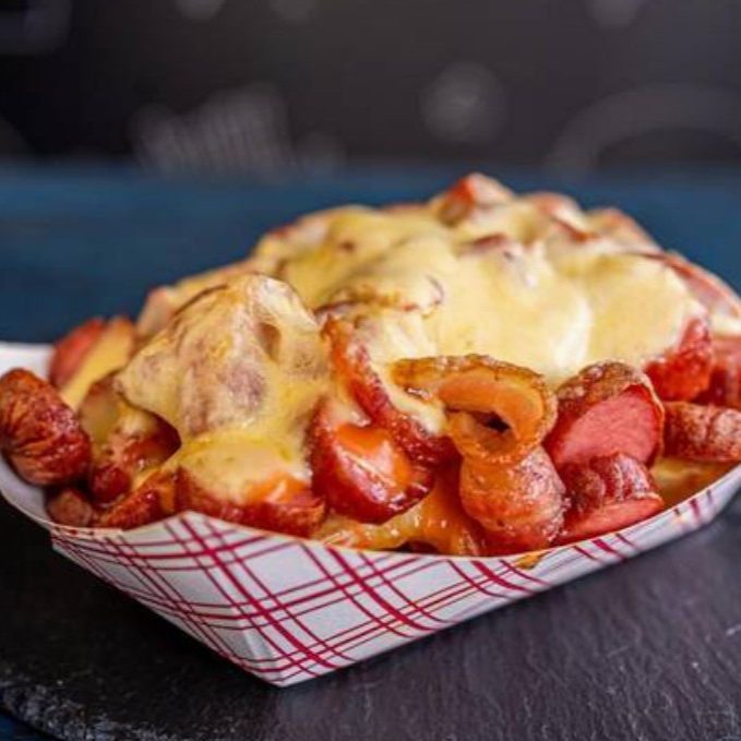 Papas fritas, salchichas, queso y tocineta.