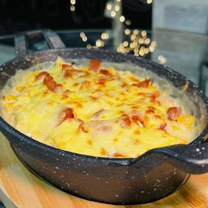 Pollo, carne de res mechada, maíz dulce, champiñones, tocineta, queso.