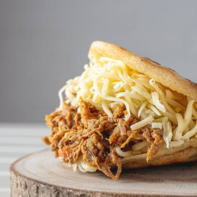 Arepa, pollo mechada, tocineta y queso.