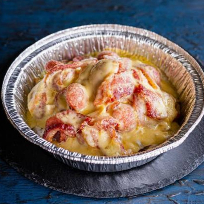 Papas fritas, queso cheddar, tocineta crujiente.