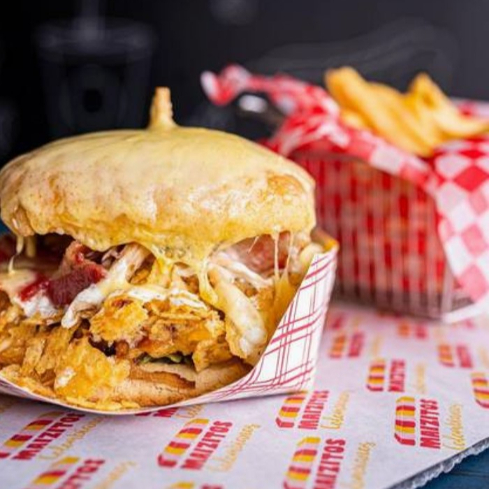 Pan, torta de carne, tomate, lechuga, cebolla caramelizada, papas tostadas, pollo mechado, tocineta y queso.