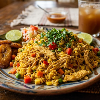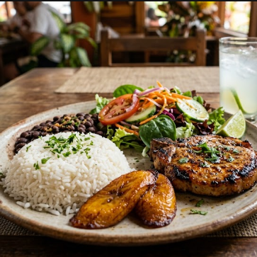 Arroz, frijoles, ensalada, plátano y proteína a elegir.