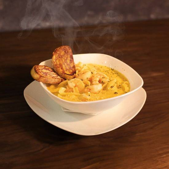 Acompañada de 2 tostadas artesanales y queso parmesano, frutti di mar: pastas con camarón y cangrejo.